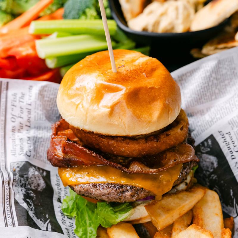 Bacon, cheddar, a crispy onion ring, chipotle aioli, lettuce, and tomato on a brioche bun.