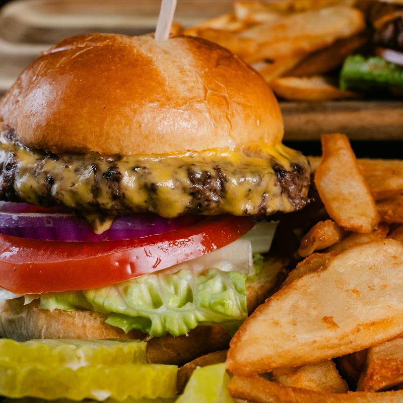 8 oz cheeseburger, mixed greens, lettuce, tomato and onion