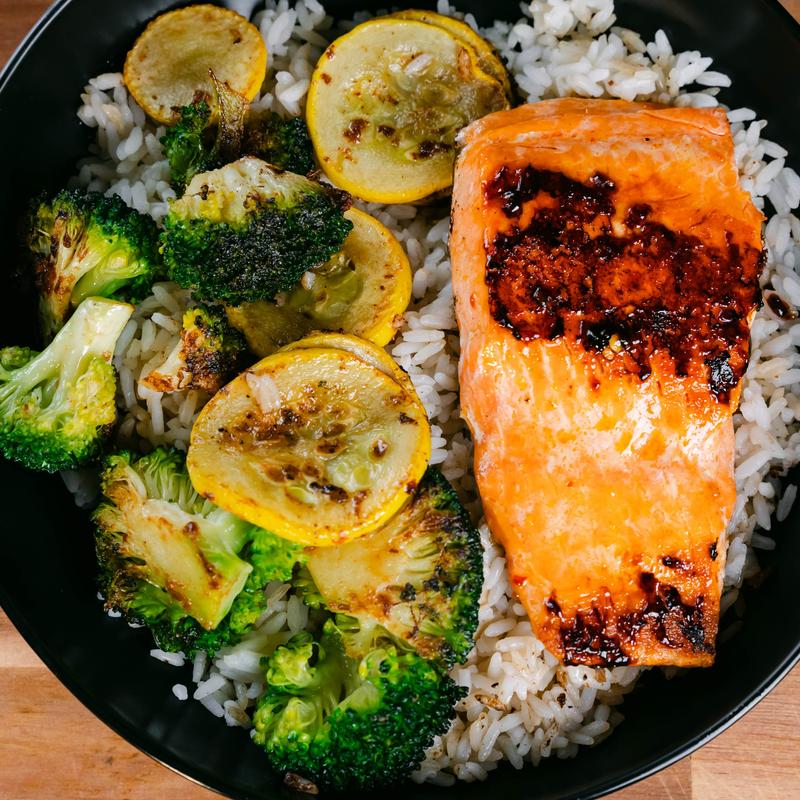 6oz Salmon with sweet chili sauce or lemon pepper served with rice and mixed vegetables.