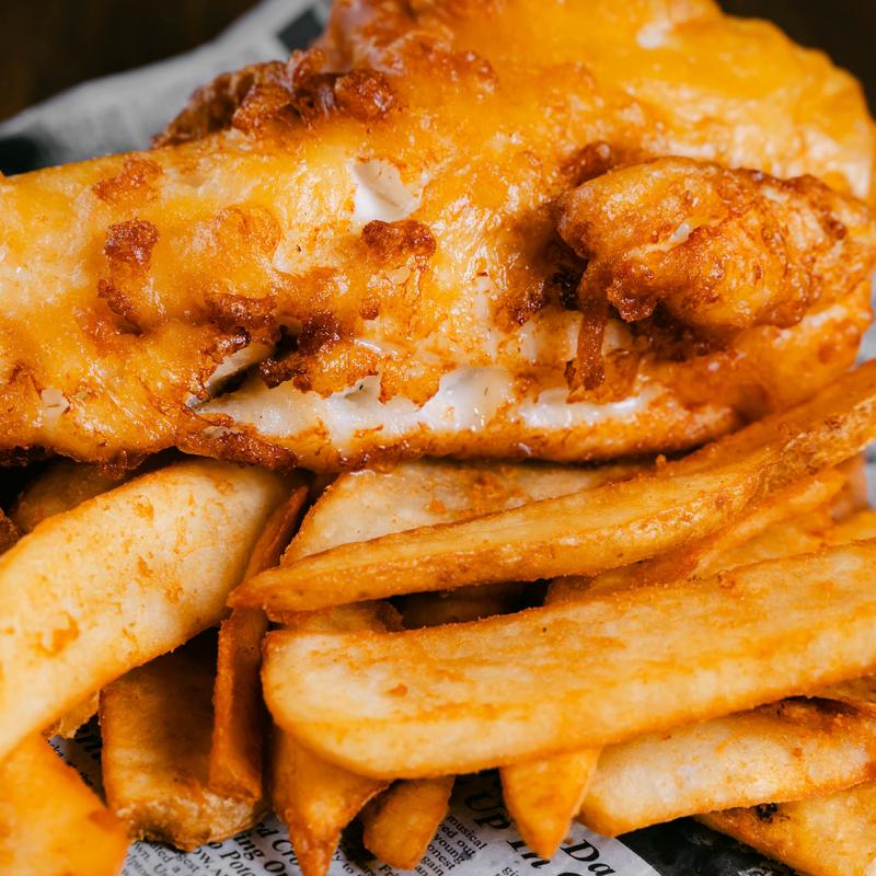 5 Guinness beer-battered cod strips, served with pub fries, coleslaw, and tartar sauce | Sub Beer-Battered Shrimp +$7.00