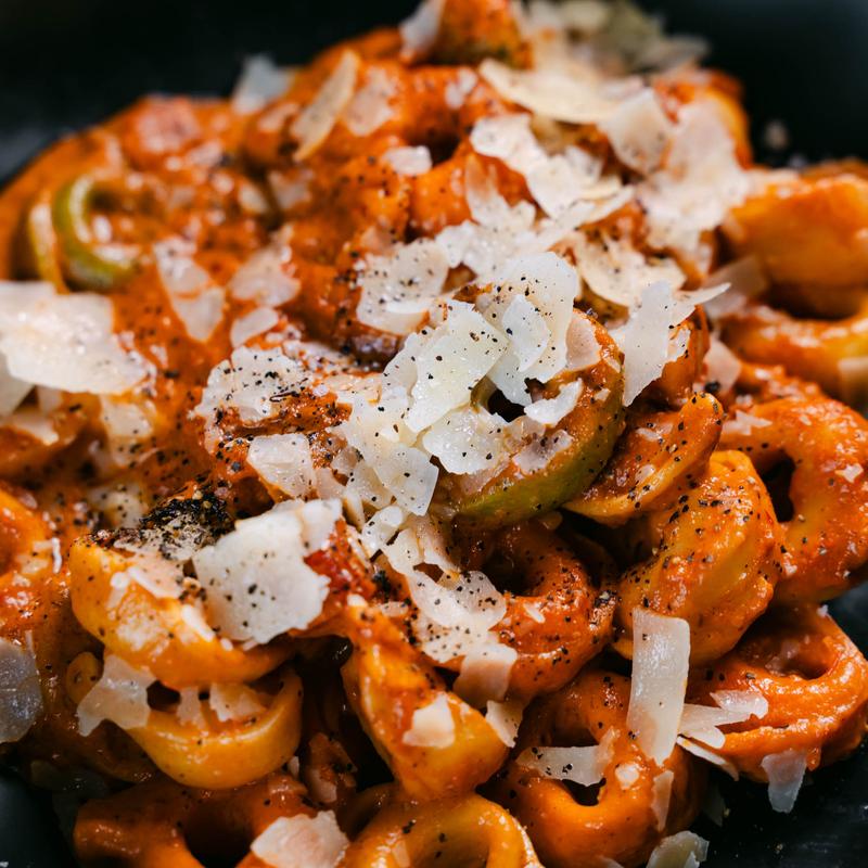 cheese tortelini with choice of rotating red or white sauce. Toppers: crispy chicken $6, braised beef, $7 shrimp $7